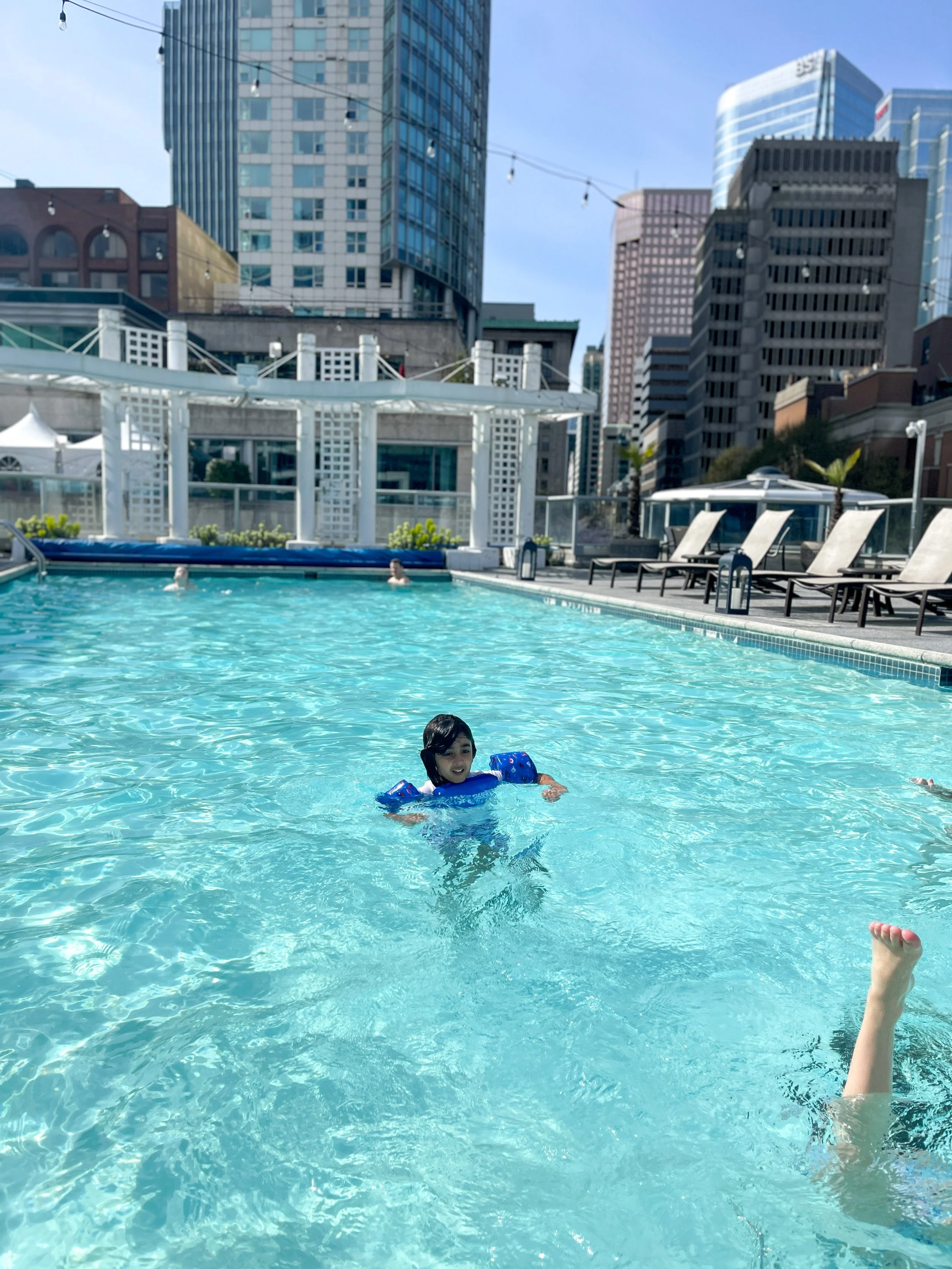 We spent the majority of our Saturday at the pool! Although we have cold weather in Vancouver, it seriously felt like a warm Summer day! The pool was SO heated and it literally felt like a warm bath. I haven’t ever been to a pool this warm. The boys were soo happy and because the sun was shining, we ended up staying for a long time. They also have some pool toys that the boys used which was nice. The outdoor pooled has views of coal harbour so we watched the sea planes come in and out which was beautiful to see. There are plenty of beach loungers by the pool so there are enough seats. Ethan and I spent some time in the hot tub as well and it was so perfect!