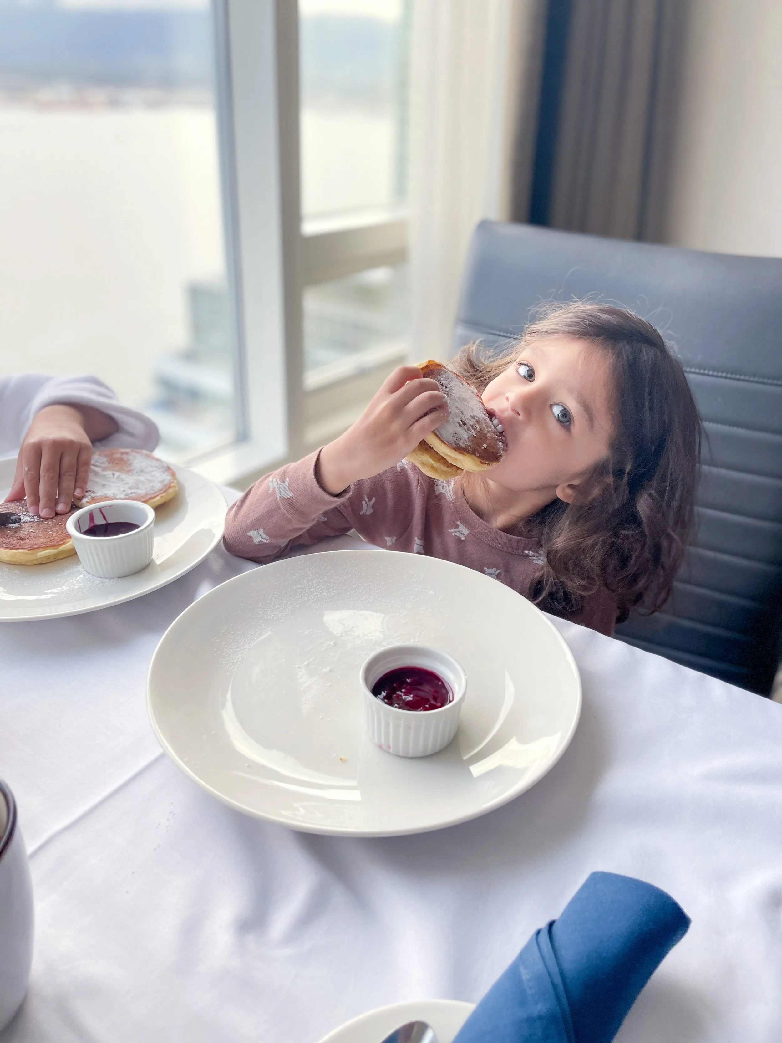 We had room service a few times and every single item was SO yummy. Ethan and Liam LOVED the kids pancakes and ordered them both mornings. Liam’s usually a picky eater but he was very happy with his meal. See his face below.